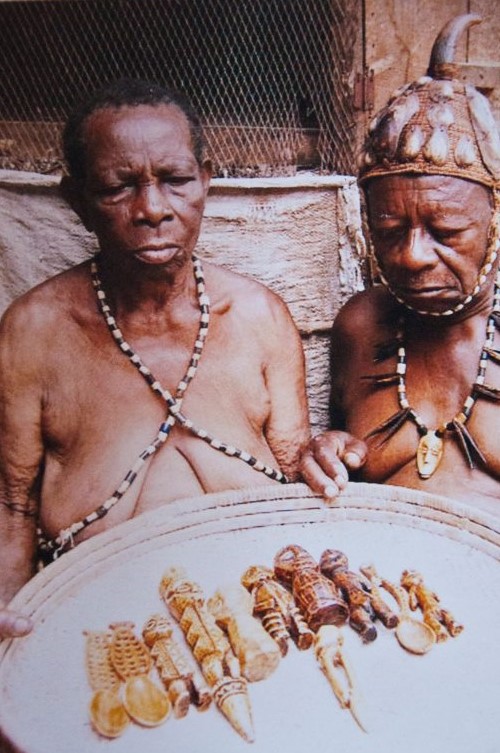 La loro differenza è espressa talvolta dal fatto che chi lo utilizza dà due nomi diversi all’oggetto. Presso i Teke, Hottot, ha raccolto per la prima volta nel 1906 informazioni di questo tipo. Ora, lo scultore conosce l’uso del pezzo che ha intagliato; egli sa che alcune parti verranno nascoste dai materiali magici che le ricopriranno. Egli può dunque non solo astenersi, ma essere dispensato dal terminarle. Saranno i fruitori stessi, conformemente alle esigenze dell’uso rituale a permettergli ciò. Non si può quindi accusarlo né di goffaggine e neppure di trascuratezza. Tuttavia questa differenza di finitura tra le parti può essere attenuata o cancellata. Anche il secondo esecutore può portare a termine accuratamente le parti che egli aggiunge. Z. Volavkova nello studio delle figure nkhisi del Basso Congo nota che talvolta lo scultore tiene conto dei futuri accessori della statuetta, e che il nganga, viceversa, può adattare i suoi materiali alla forma scolpita cogliendone i suggerimenti.