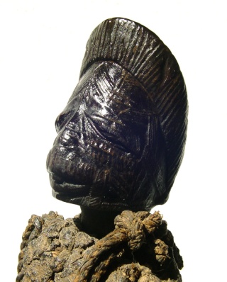 Antelope horn, wood, fiber, sacrificial matter, black oily patina