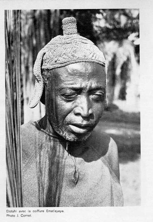 La légende racontée par Cornet (AAN, #17,1976) est évocative : une femme Ndengese, Gunji Ilunga, après de moult péripéties, crée la société masculine « totshi », dont les membres sont caractérisés par une coiffe dénommée emat’eyeye,