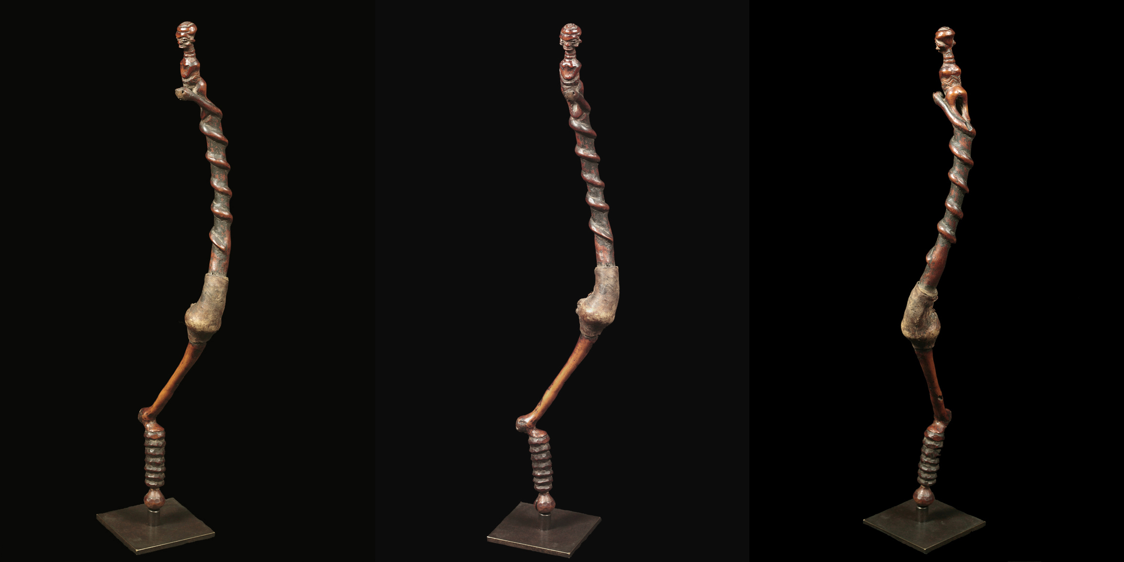 Cet objet en bois, d’une longueur de 46 cm, est caractérisé par des coupes fermes et décidées et par une surprenante spontanéité d’exécution. Le sceptre est en effet taillé dans une branche dont il suit la forme et est coupé en trois segments. Le manche est dans le segment central, comme en témoignent l’usure du bois et sa patine plus claire, signes d’un usage rituel répété.