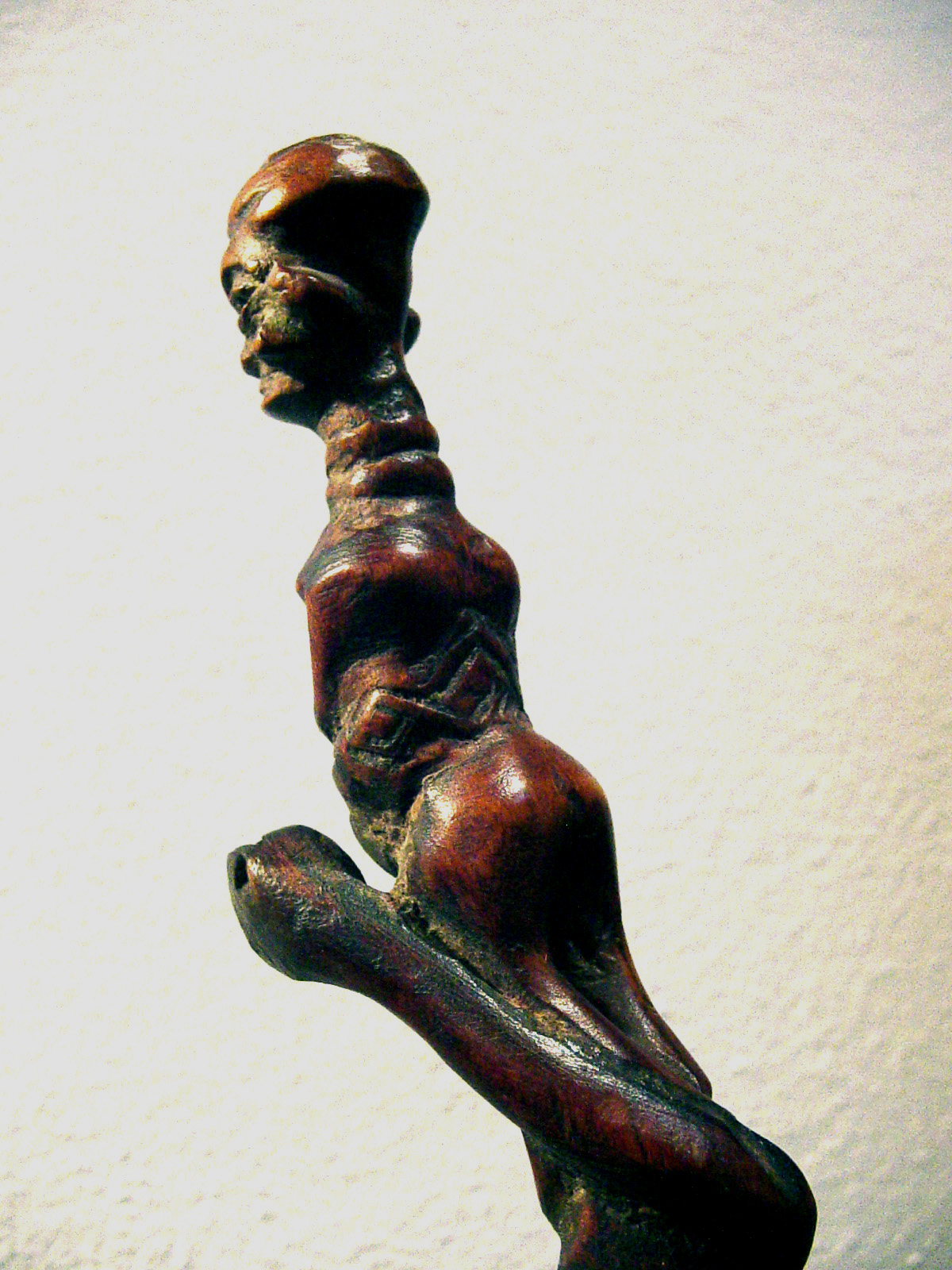 In questi oggetti, sovente, l’intervento umano è alquanto parziale e si limita ad assecondare la forma originaria del tronco o del ramo; in altri, come nel caso dello scettro Songye, lo scultore realizza un’autentica opera d’arte, pur nel rigoroso rispetto della forma originaria, scolpendo figure ed innestando sul vivo legno elementi metallici.
