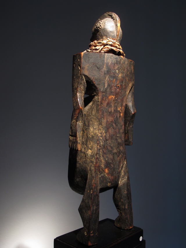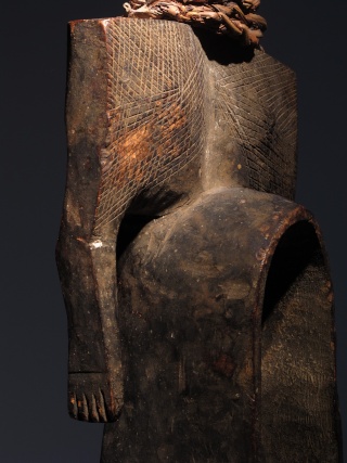 A weave of fibers separates the head from the mighty chest, in which the game of plans and empty is accentuated by the scarification that mark the volumes.
