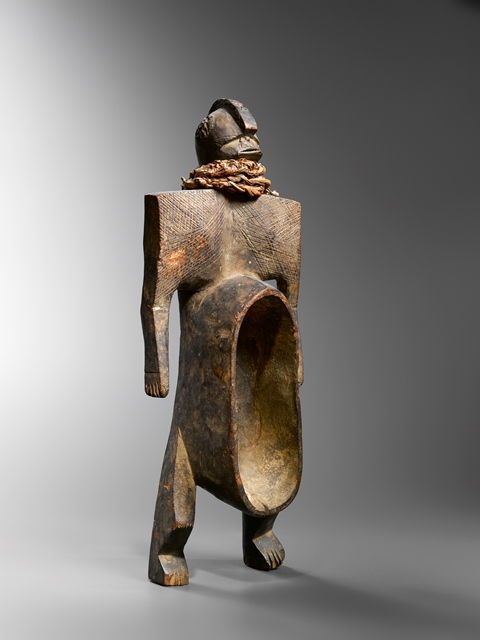 La figura è caratterizzata da un’estetica primitiva – quasi selvaggia – delle forme, tipica dell’arte nigeriana; in questo caso però la brutalità che spesso si ritrova in altre coppe cede il passo a delle raffinate geometrie.