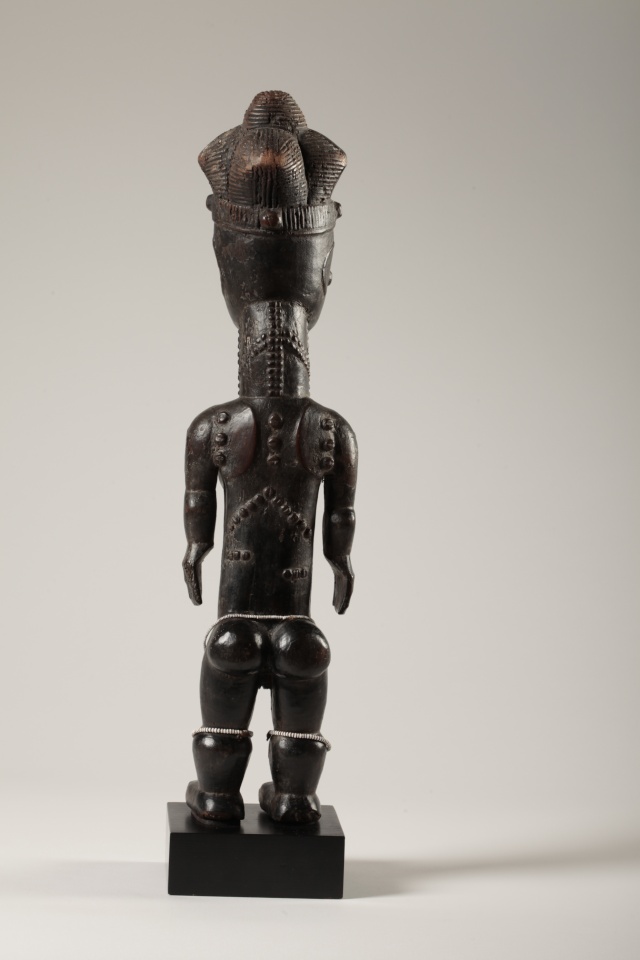 To the force expressed by the tension of curves and the strength legs responds elegance of the pose and the quiet expression, the hairstyle, the long neck ringed evoking the natural folds of the neck – criterion of beauty and a sign of social status in the Akan.