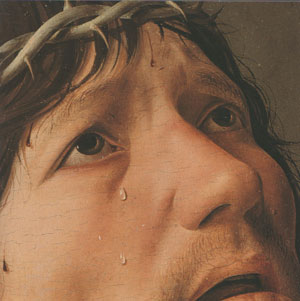 La mia personale interpretazione, e sottolineo interpretazione, è che quelle linee verticali poste sotto gli occhi, rappresentino realmente delle lacrime o in alternativa dei fiotti di sangue quali quelli visibilissimi in tutta l’iconografia cristiano medioevale, specie dei paesi del centro Europa, ma anche in quelli latini.