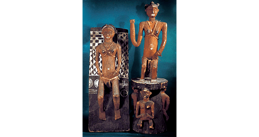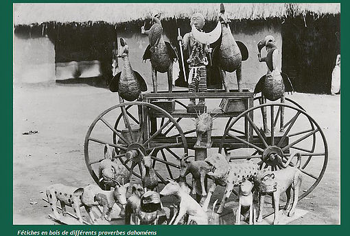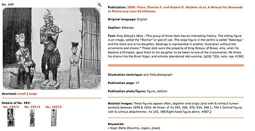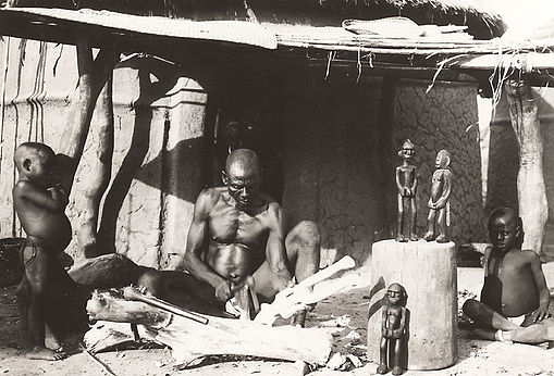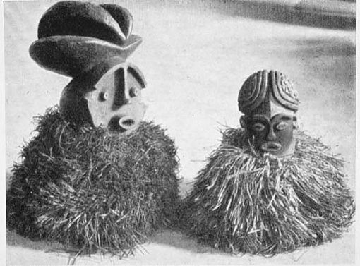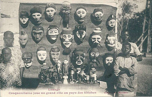 Les photos de champ avec des objets exposés sont anciennes : cette fameuse photo (1) montre aussi que des objets destinés à être vendus aux européens au début du XXème siècle (environ 1910), donc “considérés comme non authentiques” (made for the market), ont de sérieuses ressemblances avec des vedettes des plus grands musées (voir ici le cas du masque Vili du Quai Branly). Que doit-on en déduire ? La prudence est de mise…