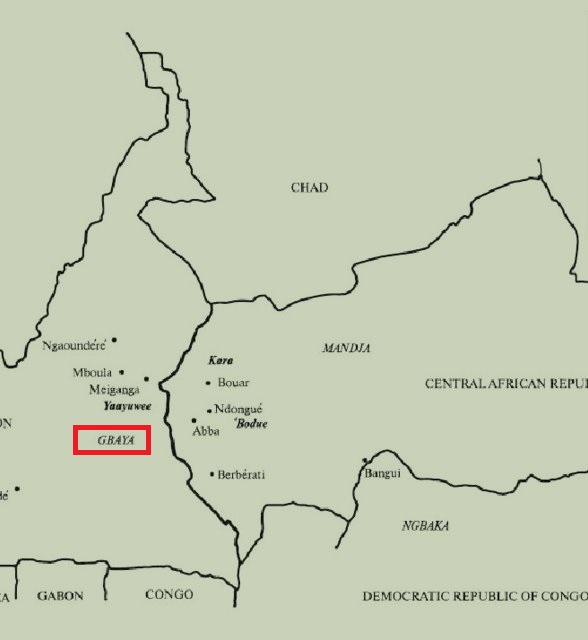 Nel mosaico delle popolazioni dell’Ubangi, l’estrema regione equatoriale a nord della Repubblica Democratica del Congo e del Camerun orientale, gli Gbaya occupano territori che travalicano i confini ufficiali degli stati e sono generalmente considerati un popolo dell’area meridionale della Repubblica Centrafricana. Rari sono i riscontri su di loro, spesso confusi con altri vicini.