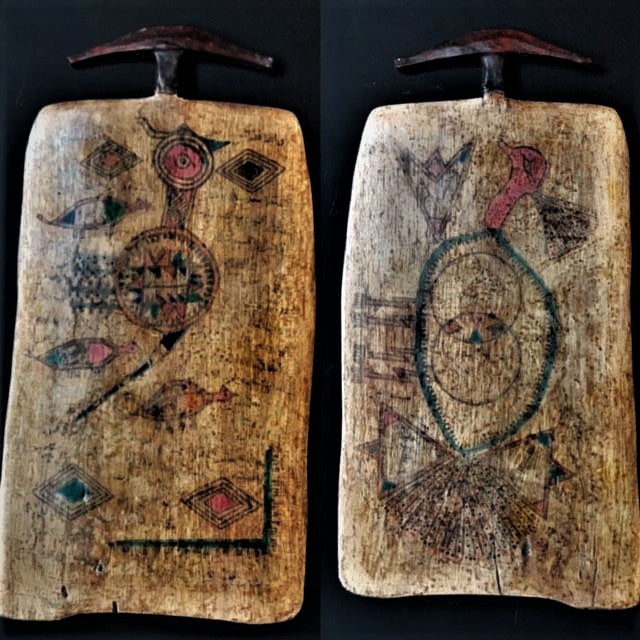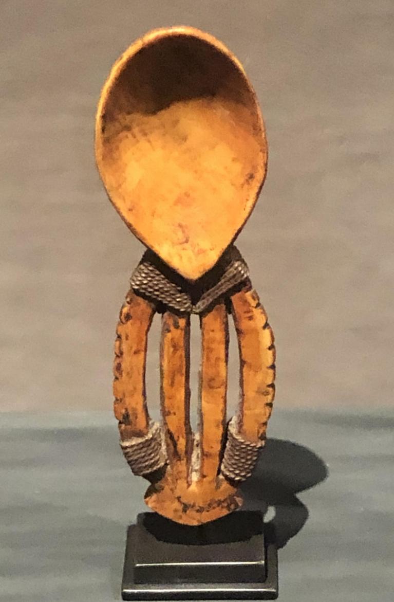 Il loro limitato corpus artistico, non garantisce, però, un’approfondita conoscenza di questa tipologia di manufatto. La fattura di questo cucchiaio è di straordinaria precisione e rigore geometrico. Creato certamente per finalità rituali, è solo apparentemente un oggetto d’uso, connotandosi viceversa quale attributo di alto rango. Gli inserti metallici conferiscono ed accentuano la forma che richiama istintivamente quella di una figura umana, sebbene sia consigliabile usare cautela nel riconoscere forme che, pur evidenti per noi, non lo erano necessariamente nell’intenzione dei loro creatori. Vera e propria scultura, il cucchiaio riceveva più volte diversi versamenti rituali a base di olio e polveri rossastre e, con ogni probabilità, era oggetto di periodici sfregamenti con foglie abrasive.
