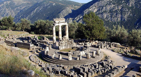 I resti del tempio di Atena ( fine del V sec. a.C.) nel Sacro Recinto di Delfi,