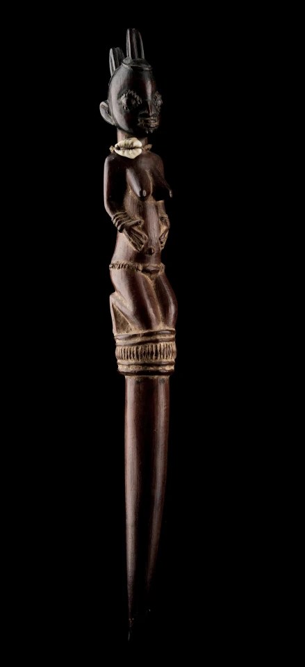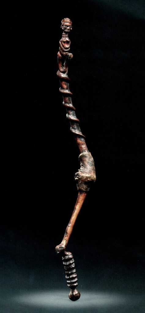 Questo scettro utilizzato probabilmente dai diviner della società Dombe, sebbene non sia da escluderne l’utilizzo anche da parte dei forgerons (Botsfuji) o dalla scietà dei cacciatori (Ecoho), è anch’esso un’opera di questa etnia e rappresenta quasi un unicum nel novero dei rari esemplari conosciuti.