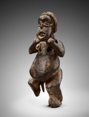 Questa figura, capolavoro dell’arte scultorea Dengese, si sviluppa secondo un criterio volumetrico cilindrico accentuato dalle lunghe braccia e dalle grandi mani poggianti sul ventre. É arricchita da una livrea cromatica che la ricopre interamente, dalla testa fino ai grandi genitali, che in questa scultura sono purtoppo andati perduti, simboli forse della perpetuazione dell’etnia.