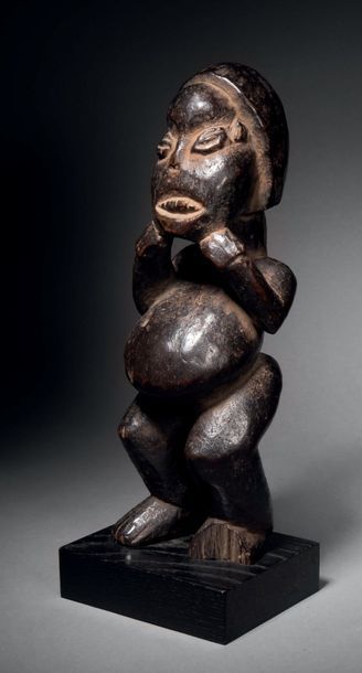Forse la gravidanza e la maternità, sul piano iconico e scultoreo, erano la testimonianza della precarietà fisica e della sofferenza materiale del parto e, successivamente, dell’impegno nell’accudimento del figlio. In passato, le donne di questo popolo non vestivano alcun panno e quando il re designato ne fecondava una, questa era denominata makoukam, cioè la destinata a perpetuare la stirpe reale. La sua rappresentazione iconica era quella di una donna incinta con la mano destra appoggiata sul ventre prominente, ovvero, come in questa nostra figura con entrambe le mani sotto il mento. Durante i riti di consacrazione, queste statue ricevevano particolari trattamenti da parte dei guaritori, i kun’gan, che provvedevano anche a celare in esse sostanze magiche. Il volto della scultura è espressivo, la faccia è rivolta in alto e con la bocca aperta mostra i grandi denti, il corpo è compatto, la postura fiera. Queste sculture, utilizzate a scopo divinatorio e terapeutico, erano diffuse nell’iconografia artistica dei Bamileke, e ricevevano varie definizioni da parte dei diversi sotto-gruppi etnici.