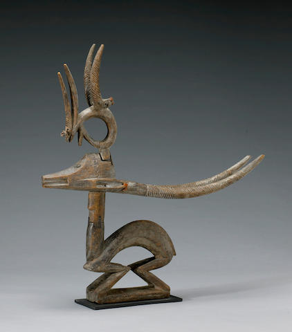 Un’altra peculiare e rilevante creazione artistica del popolo Bamana era costituita dal copricapo denominato chi-wara o ci-wara, ispirato dai canoni stilistici regionali e realizzato secondo la fantasia creativa degli artisti. Questo copricapo era concepito nell’ambito della società chi-wara che con la kòmò e la kònò, faceva parte delle società iniziatiche Bamana. La figura è sostanzialmente la rappresentazione di un’antilope maschio. La maschera-copricapo era fissata sulla testa del danzatore con l’ausilio di un paniere di fibre vegetali. Un cappuccio di tessuto che copriva il volto del danzatore, oppure un costume di copiosissime fibre vegetali che lo rivestiva interamente, completava il corredo di danza. Questa chi-wara, dello stile di Ségou, è caratterizzata dalle lunghe corna verticali, leggermente ripiegate all’indietro, dall’appuntito muso, dal corpo con la duplice, ampia semi-corona traforata e seghettata ed infine dalle imponenti orecchie drizzate.