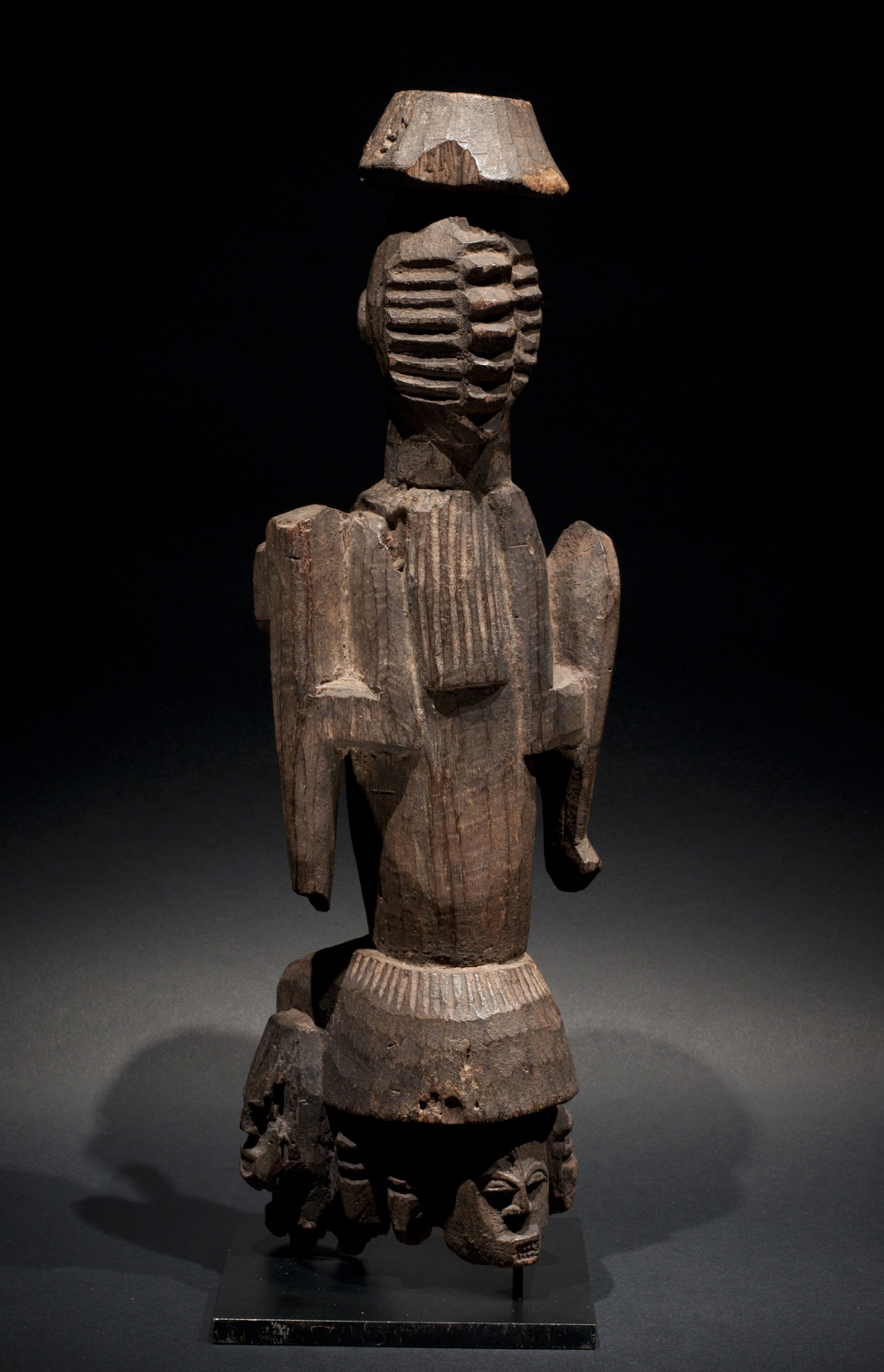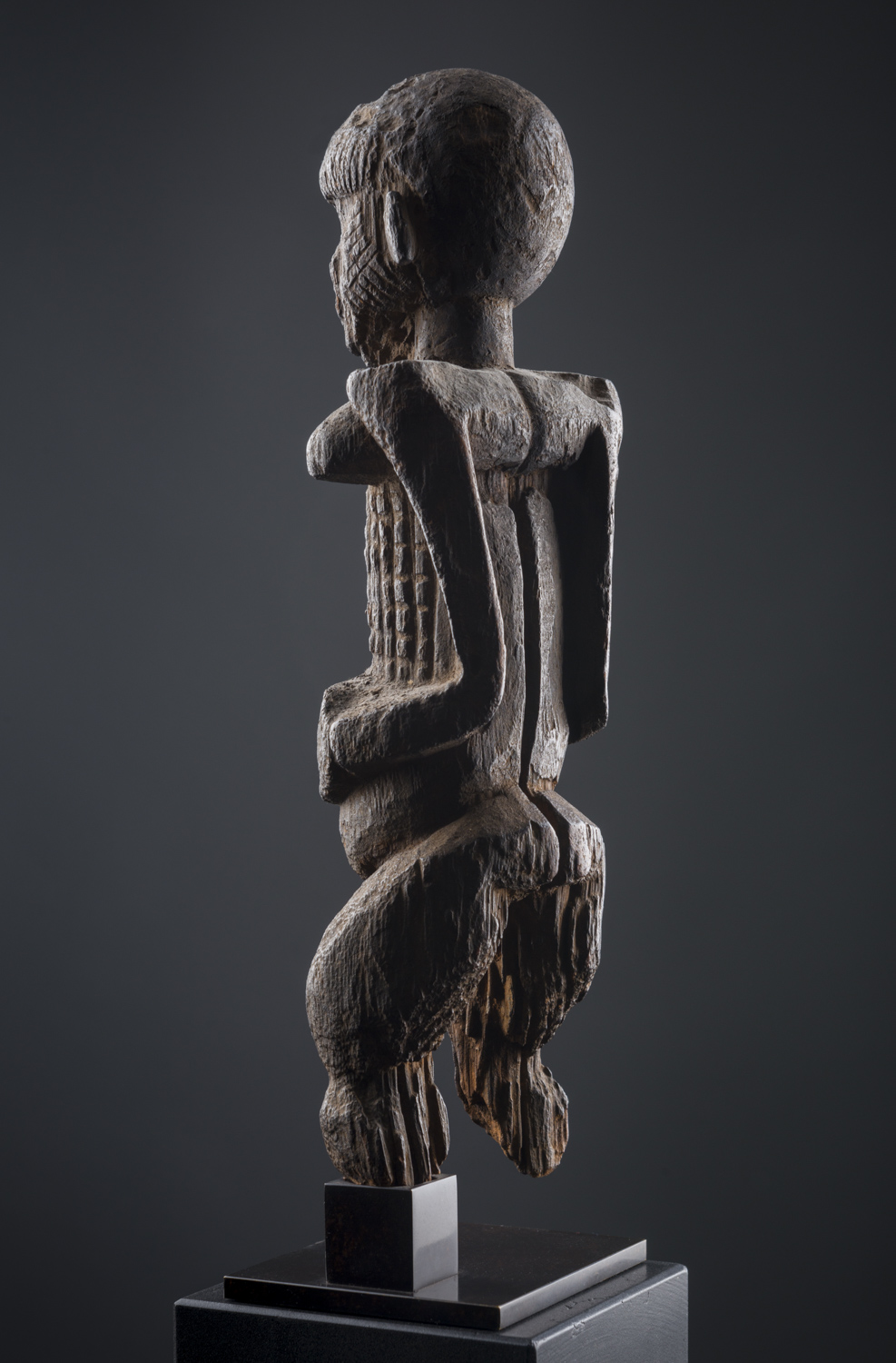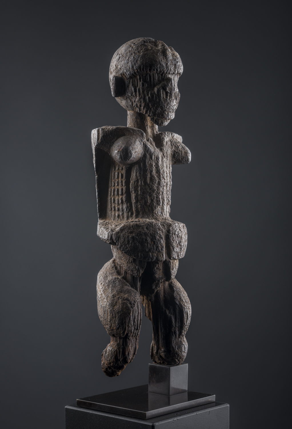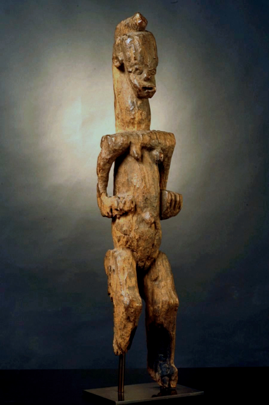 Allo stesso modo, la figura di questa scultura Kabye del nord del Togo stempera la supremazia della verticalità, ma non per questo sfugge alla celebrazione monumentale.
