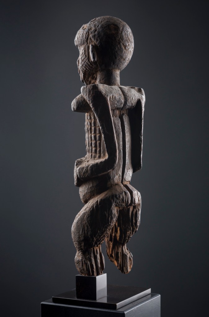 Osserviamo. Le sculture, due figure funebri Bongo del Sud-Sudan e Konso dell’Etiopia, hanno in comune un gesto atavico, ritmato da precise angolature che evidenziano la cogente assenza di incertezza e dubbio: quelle braccia trattenute sui fianchi per devozione, nella figura Bongo, è una soluzione euclidea che regola sia la geometria che la preghiera.