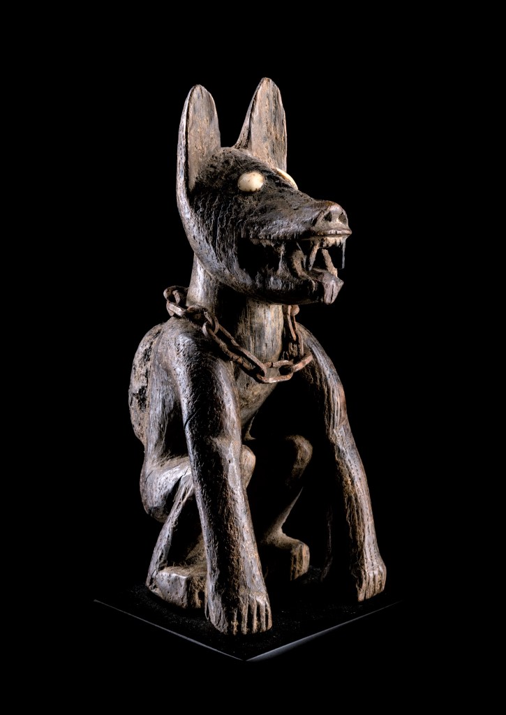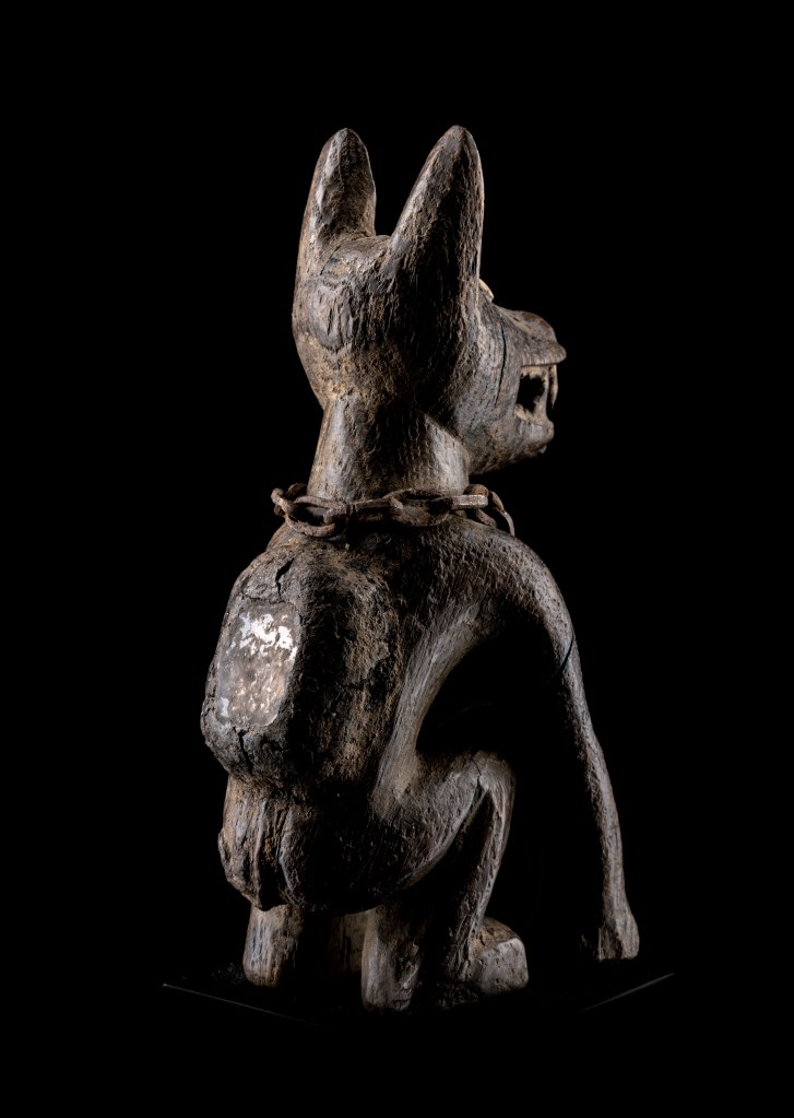 I cani poi, muovendosi liberamente e senza limiti tra villaggio e foresta, attraversando cimiteri, sia di giorno che di notte, rappresentavano per quel popolo, il contatto duale tra il mondo materiale e quello dell’invisibile, tra quello dei vivi e quello degli antenati: personificavano, in una parola, l’inscindibile rapporto tra i due mondi. «Au chien, cet indispensable complice des chasseurs, est attribué le rôle de traqueur de sorciers et de gardien de maisons, son image sculptée suffisant à protéger le village des esprits malins» (7)