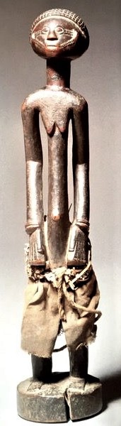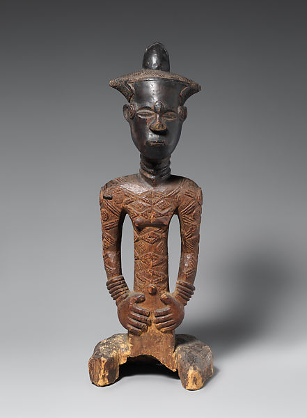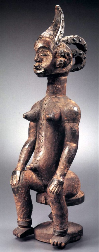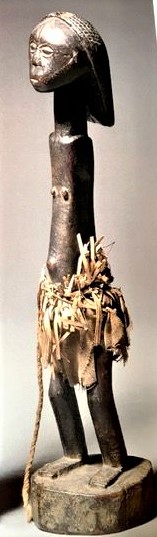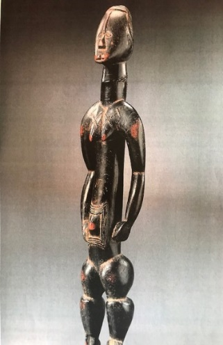 La figura femminile , dalla rigida postura frontale mitigata dai morbidi volumi, si caratterizza per un’evidente dismorfia anatomica che accentua la creatività artistica dell’autore e forse celebra la figura di una mitica antenata. Lo stile scultoreo ha diverse similitudini con la maschera: la piccola testa appuntita con gli occhi ravvicinati alla radice del naso, il rilievo sagittale sull’ampia fronte bombata, insieme ad una comune patina lucida e nerastra. Il canone stilistico è il medesimo, pur nella mutevole interpretazione delle due opere. La forza con cui l’artista ha messo in evidenza il grande ombelico delimitato dalla quadruplice scarificazione a forma di rettangolo lobato, forse rimanda al significato dell’origine e della perpetuazione della stirpe.