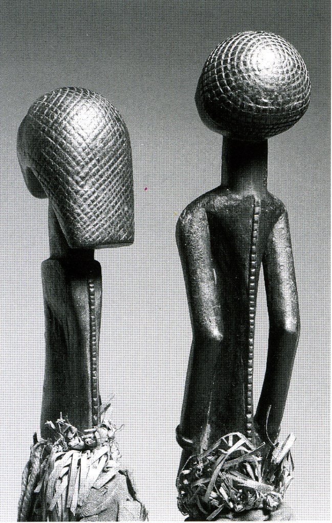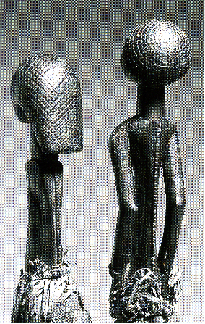 Queste due figure da reliquiario, caratterizzate dalla piccola testa ed il lungo collo di legno rivestiti di lamine e di fili di ottone, appartengono al gruppo etnico dei Sango o Masango e sono denominate mbumba bwété. La loro provenienza geografica è la regione occidentale dei Kota, in particolare lungo la vallata del fiume Ogooué e del suo affluente Sébé.