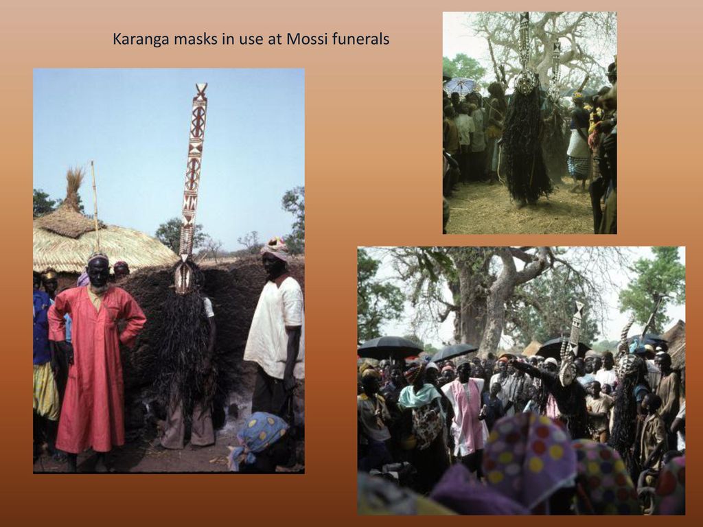 La maschera karanga proviene dal nord del Burkina Faso. Pare fosse utilizzata nell’ambito del clan Nyoinysé, rinomato perché in grado di mobilitare le forze dell’invisibile per colpire con la folgore i nemici Nakomsé. Lo stile di riferimento è quello risiam, uno dei tre stili del nord, insieme a yatenga e kaya. Il canone stilistico risiam prevedeva che le maschere, a livello del viso del danzatore, fossero convesse. La testa di antilope è posta sopra il casco carenato che non presenta le classiche scarificazioni sul volto, assenti, peraltro, anche in alcune maschere facciali sormontate da figure femminili.