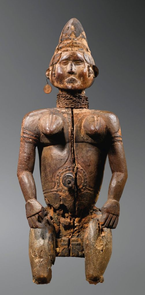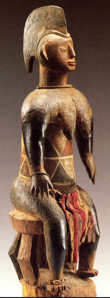 Nella rarità del corpus sculturale, la grande figura d’altare, presentata sotto il titolo, è la prova, come le altre due figure del resto, del talento dell’artista che l’ha realizzata. Degli Igala, infatti, sono più conosciute e diffuse le maschere agba ed agbanabo, utilizzate nei riti funerari aku e nelle cerimonie di sostegno del potere regale. La figura è assisa su uno sgabello, le gambe semiaperte, le braccia discoste dal corpo, l’espressione del volto enigmatica. Ma è la presenza della policromia che la caratterizza e ne fa un’opera di grande valenza artistica, oltre che rituale. Un fregio di losanghe colorate nasce sotto i pesanti seni per finire al limite del basso ventre; triangoli di colore marrone, arancio e bianco si alternano, sfidando la rigida impostazione della figura che porta sul capo un’acconciatura-cimiero di rimarchevole eleganza e rigore. Una scultura che sintetizza e testimonia la complessa storia di un popolo attraversato da infinite suggestioni e complesse influenze culturali.