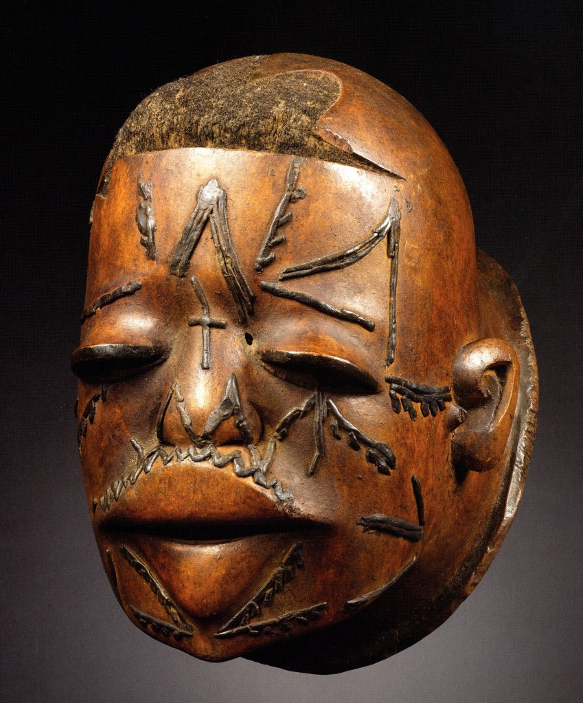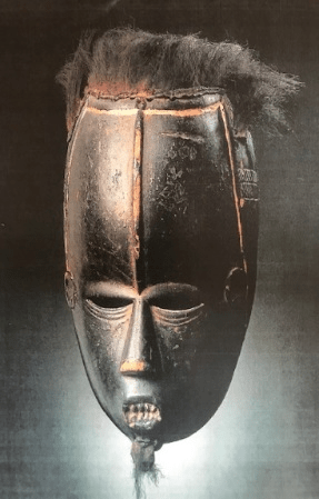 Questa maschera del guerriero, comune a tutti i popoli della Costa d’Avorio occidentale e meridionale, nel periodo precoloniale era, insieme alla rappresentazione del combattimento, parte integrante degli aspetti folklorici ed epici della narrazione tradizionale. Uno dei suoi ruoli era di imporre la pace durante i conflitti interni e monitorare le forze ostili della foresta. Era anche espressione del controllo sociale ed agiva nell’individuare e rintracciare gli stregoni e coloro che trasgredivano le norme. La realizzazione di maschere di questa tipologia, non erano soggette a requisiti formali particolarmente rigorosi ed i fabbri scultori agivano secondo il loro talento interpretativo. Un esemplare simile, con la grande fronte bombata, sormontata da pelle di animali e segnata dal rilievo sagittale, con le caratteristiche incisioni sotto gli occhi, la bocca aperta a mostrare i denti limati, è appartenuto negli anni ‘30 a Tristan Tzara, mentre una terza maschera, forse dello stesso atelier, è conservata presso l’Art Institute di Chicago.