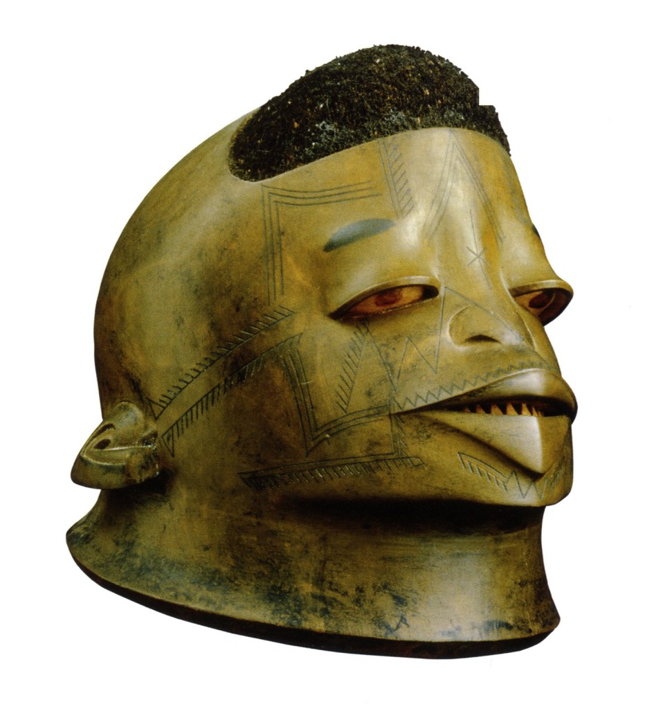 Un’altra arcaica maschera-casco della stessa etnia. Misura 28 cm ed appartiene ad una collezione privata francese.