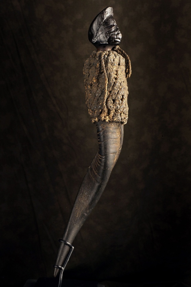 Nella fattispecie, infatti, questo antico corno contenente sostanza medicale ed olii sacri (ntela) reca sulla sommità una miniatura di legno, a guisa di testa, di grandissima qualità scultorea che funge da chiusura del contenitore. Anche su questa testa sono visibili i tradizionali tatuaggi dell’etnia ed è sorprendente la cura dei particolari che l’artista è stato in grado di realizzare con somma perizia.