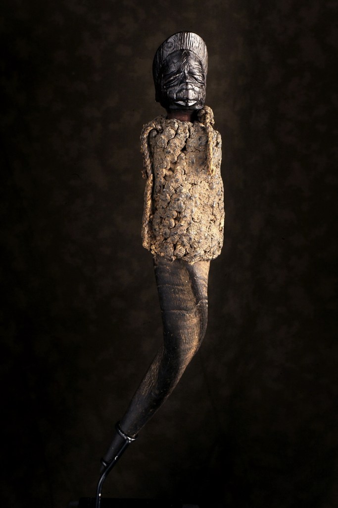 “Calabashes and antelope horns are frequently used as containers for medicines, sacred oils, and other substances among different Tanzanian peoples. They are often closed with beautifully carved wooden stoppers, miniature heads that mimic larger sculptures and masks. As part of their healing repertoire, the Makonde use horn containers filled with medicinal substances. These functional objects even more potent as healing devices when they are combined with feathers and carved heads that may represent ancestor spirits”. (Frank Herreman 1997)