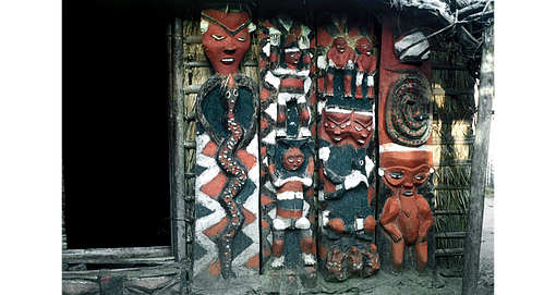 D’Océanie, la collection incluait une exceptionnelle figure provenant de la région du lac Sentani, sur la côte nord de la partie indonésienne de la Papouasie Nouvelle-Guinée, collectée par Jacques Viot (1898-1973), en 1929. Les représentations d’une mère avec son enfant étant rares dans l’art océanien, cette sculpture représenterait peut-être plutôt un individu et son ancêtre tutélaire. Les Sentani vivaient dans des villages construits sur pilotis. Jusqu’au début du XXe siècle, la maison du chef était la plus grande structure du village et était souvent décorée de sculptures représentant une variété de sujets. Des figurations de ce type ornaient le sommet des poteaux qui soutenaient le toit et le sol de la maison et étaient également gravés dans les pieux qui supportant les ponts de planches reliant les maisons du village.