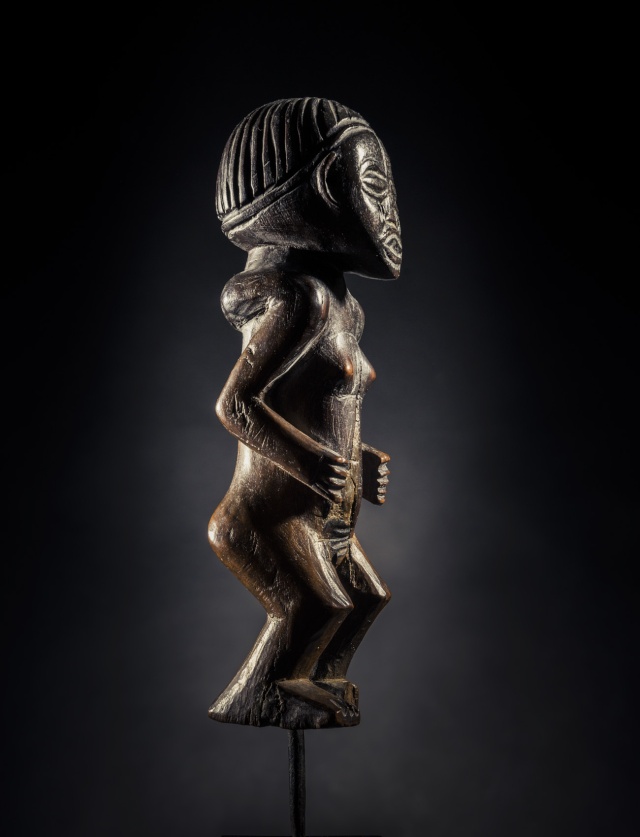 “This compact little object has concise forms. Seem from profile, the figure has a pleasing rhythm. The convex shoulder blades work with the arms to produce a sculptural result which is reminiscent of that seen in works from distant neighbouring groups, such as the Yaka or the Suku. The face and the coif are rendered with linear grooves and incisions. The manner in which the chin comes to a point gives the face a heart-shaped form.