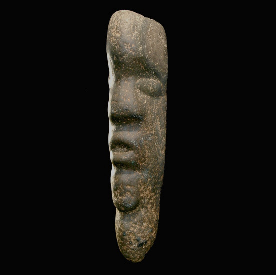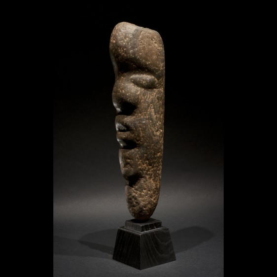 Il volto e la coiffure sono resi con incisioni e scanalature lineari. Il mento a punta, dà al viso un’impronta a forma di cuore. La patina è scura e sudante sulla faccia, e si alterna tra nero e marrone lungo il corpo.
